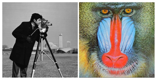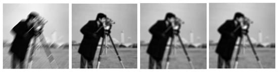 In this part, we present the restoration of an image that has been corrupted by a motion blur specified by a motion length of 22 pixels and a motion orientation of 45 (blur matrix ), a Gaussian blur with a filter size of and a standard deviation of (blur matrix ), an out of focus blur or a circular average filtered blurred image with a radius of (blurred matrix ), and an average blur with a filter size of (blurred matrix ), respectively. We use Algorithm 2 to restore the original grey (cameraman) and RGB (baboon) images, which are shown in Figure 1. Blurred grey images and blurred RGB images with a blurred matrix – are shown in Figure 2 and Figure 3, respectively.