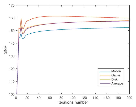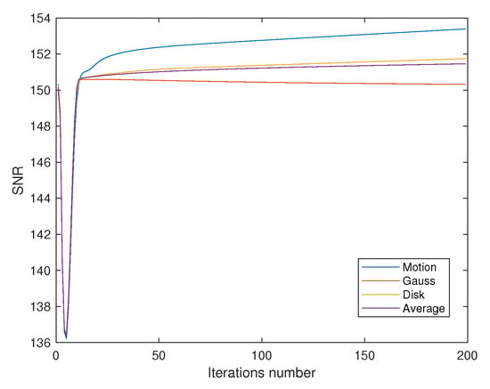where x is an original image. The behavior of SNR for the Algorithm 2 of all cases for grey and RGB images are shown in Figure 6 and Figure 7, respectively.
