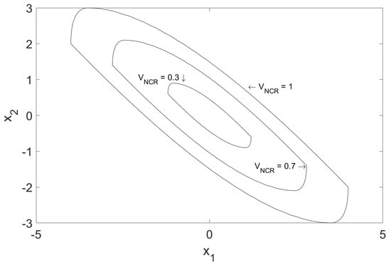 To illustrate the proposed control design, we consider a linear system of the form of Equation (2) with and . The NCR is computed using the Minkowski sum of the single input system’s NCR’s—as defined by Equation (4). MATLAB’s boundary function is used to extract the boundary of the multi-input systems NCR. The boundary is then multiplied by values ranging from 0 to 1 (increasing by increments of 0.005). The results are stored in MATLAB’s scatteredInterpolant function; this vector serves as the numerical approximation for , and the level sets can be seen in Figure 1.