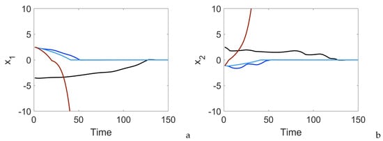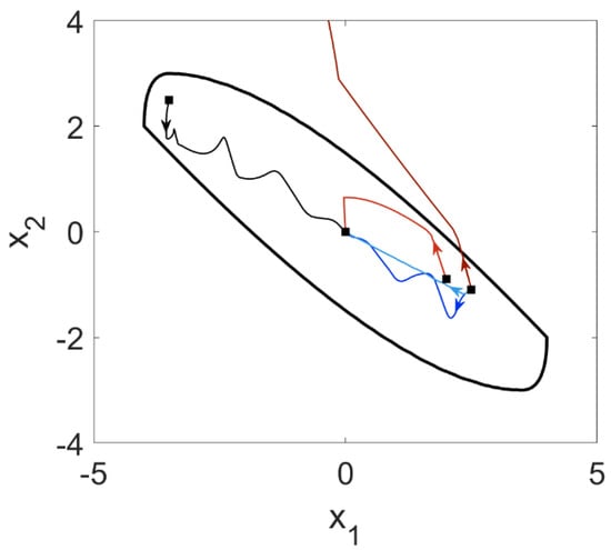 From an initial condition of , the predictive controller is implemented with to stabilize the system. As shown by the light red line in Figure 2, closed-loop stability is achieved. Moving further away from the origin to an initial condition of , the controller fails to achieve stability under . The red lines in Figure 3a,b and Figure 4a,b show the state trajectories and input profiles of this outcome.