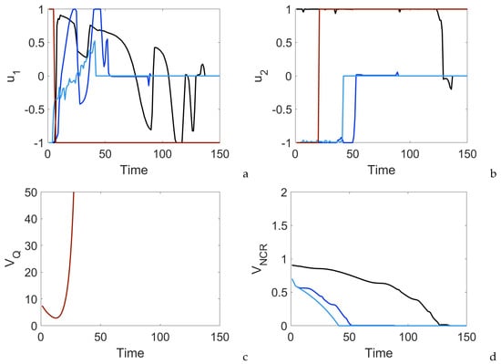 The system input profiles (a,b) with with an initial condition of (red), for an initial condition of with , (light blue), and (dark blue) and for an initial condition of with , (black), (c) evolution of the quadratic Lyapunov function, with an initial condition of (red), (d) evolution of for an initial condition of with , (light blue) and , (dark blue) and for an initial condition of with , (black).