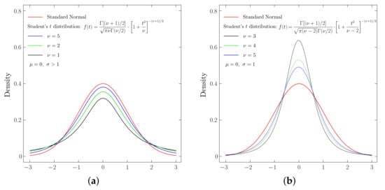 Student’s t distribution is another popularly used distribution for volatility modeling. Depending on the variance, there are two kinds of Student’s t distribution: with non-unit variance (described in Figure 2a) and with unit variance (described in Figure 2b).