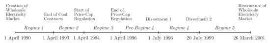 During the liberalization process, the regulatory authority introduced several reforms in the England and Wales electricity market. The regulatory reforms are described, for example, in [33,34]. In Figure 4, we summarize the timeline of those reforms.