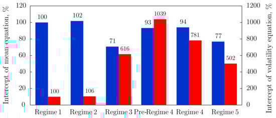 For the qualitative analysis we recalculate intercept terms of the mean and volatility equations in percentages, where the intercept term for the reference period, i.e., Regime 1, is set equal to 100%. The calculations are summarized in Figure 6.
