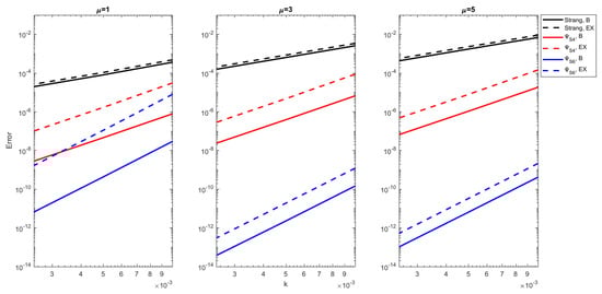 For the numerical experiments in this section, we consider splitting integrators of m stages, with coefficients , , , and , which are particular cases of the symmetric ones [3]. More specifically, we use the Strang method with order , and coefficients and and two other methods that are particular cases of symmetric-splitting methods, whose coefficients are given in the following way: Let be an even number; then, we consider a method with stages satisfying , , and , for . (Note that our parameter l is called m in [3]).