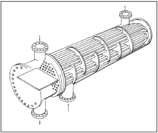 Heat exchangers are used in multiple scopes, for this reason, there are a lot of different types of configurations. Two of the most common and important models are shell and tube heat exchangers (STHX) and plate-fin heat exchangers (PFHX). Both are widely used in countless industries, such as process, power, transportation, air-conditioning and refrigeration, heat recovery, alternate fuels, and manufacturing industry. These heat exchangers are, as well, key components of numerous industrial products available in the marketplace. STHX are more commonly found in process industries, in conventional and nuclear power stations as condensers, in pressurised and water reactor plants as steam generators, as feedwater heaters, etc. On the other hand, PFHX are typical compact heat exchangers which are found to have several applications in the industries of petroleum, petrochemical, chemical and power generation [4,5,6,7,8]. Figure 1 shows one of the simplest configurations of a STHX. This is a one-shell and two-pass through the tube’s configuration, also referred to as STHX (1-2).