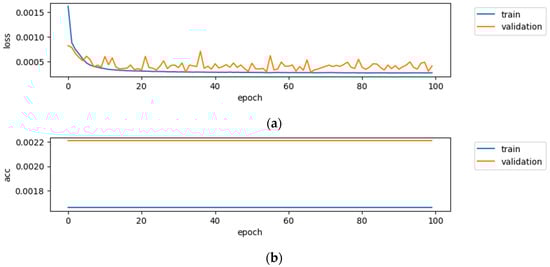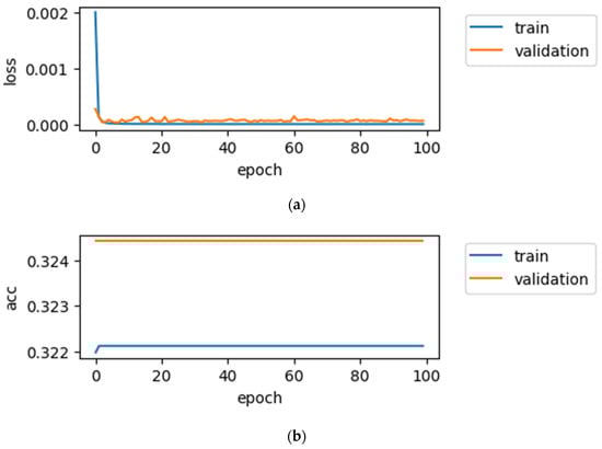 Figure 5 shows the results for the mono-objective NN of exchanged heat (XH). In the case of the loss (a), values very close to 0 are obtained from the first epochs of the system. It can also be seen that these data are very close to those obtained in the validation phase, although the validation data are slightly higher than those obtained during training. In the second graph (b), it can be seen how the prediction accuracy maintains a stable result since the first epochs. This mono-objective network generated provides an accuracy of around 32% in both training and validation.