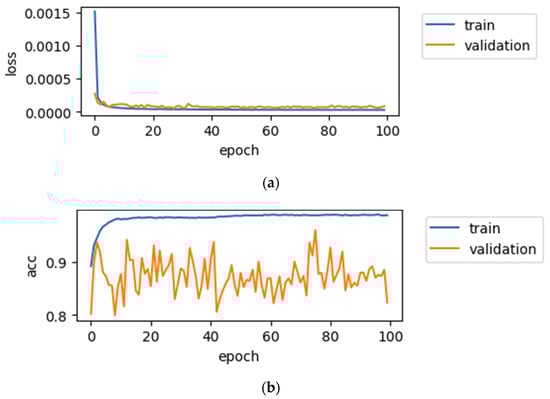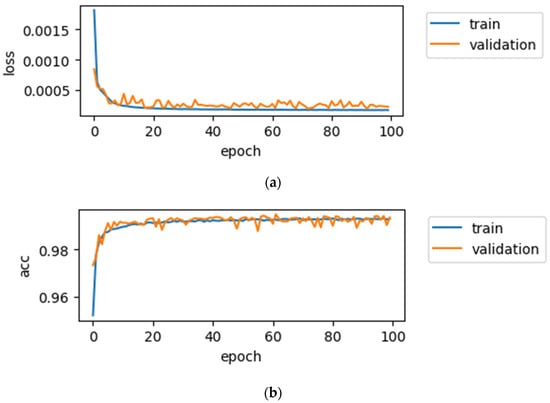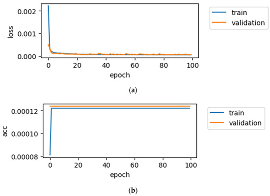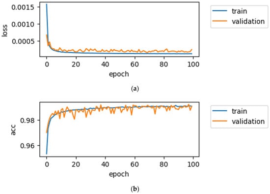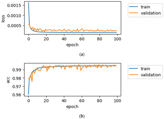 Figure 11a shows the NN loss output. The loss results reflect a similar performance as in the previous two targets NNs. Both in training and validation it is found values close to 0 from the first epochs. As for the accuracy (b), a truly good performance was obtained with values close to 99% from the beginning.