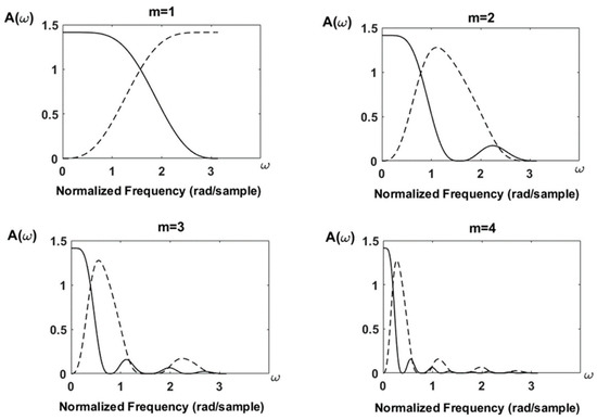 It follows from (6) that the component gives approximation with resolution (it approximates the trend). The detailing component has the resolution , and approximates the local features of the scale . Figure 1 shows the amplitude–frequency characteristics (AFC) of the scaling function (solid line) and the wavelet (dashed line) for different , obtained for the 3rd-order Daubechies wavelet.
