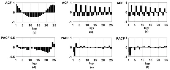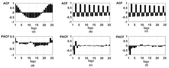 Thus, we can obtain different representations of in the form (5) for different . Obviously, it is necessary to determine the level of expansion , for which the component is regular. It is natural to assume that the component is regular if it is strictly stationary. In this case, the problem of determining regular components is reduced to the problem of obtaining representation (5) for which the component is strictly stationary. The condition of stationarity of the component will allow us to identify the ARIMA model for it. Following the theory by Box and Jenkins [20], a time series is strictly stationary if its autocorrelation function (ACF) damps rapidly during average and large delays. To determine the model type (AR, MA, ARMA) and the order, ACF and partial ACF (PACF) are studied [20]. Taking into account the fact that the resolution decreases with the increase, we define sequentially: