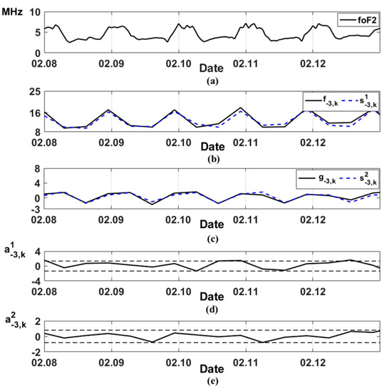 Figure 4 shows the modeling results for HMTS regular components ( and ) during the absence of ionospheric anomalies. The model errors do not exceed the confidence interval that indicates their adequacy.