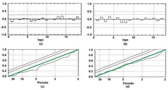 According to the criterion, if the model is inadequate, the average grows. Consequently, the model adequacy can be verified by comparing with the table of distribution. The results in Table 2 and Table 3 show that the values of the estimated models, at a significance level , do not exceed the table values. The model adequacy is also confirmed by the analysis of residual error ACF (Figure 5a,b) and the normalized cumulative periodogram (Figure 5c,d).