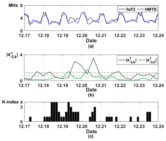 Modeling of foF2 data for the period from 17 December 2019 to 24 December 2019. (a) foF2 data (black), HMTS (blue); (b) errors of (black) and (green), dashed lines show 70% confidence intervals; (c) K-index values.