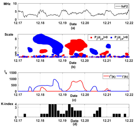 Assessment of the intensity of positive and negative ionospheric anomalies is shown in Figure 7c, positive anomalies are shown in red, negative ones are shown in blue. Figure 7d shows the K-index values. The results show the occurrence of a negative ionospheric anomaly during the initial and the main phases of the magnetic storm (18 December 2019), and a positive ionospheric anomaly during the recovery phase of the storm (19 December 2019). The observed dynamics of the ionospheric parameters are characteristic of the periods of magnetic storms [43]. The results show the efficiency of HMTS application for detecting ionospheric anomalies of different intensities.