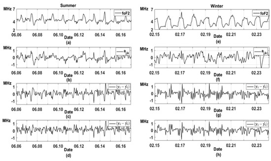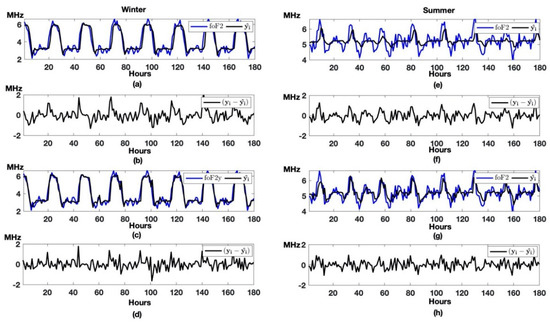 Errors of HMTS and NARX SPA for summer (from 6 June 2019 to 16 June 2019) and winter (from 15 February 2019 to 23 February 2019) seasons: (a,e) foF2 data; (b,f) HMTS errors; (c,g) NARX SPA errors (network delays ); (d,h) NARX SPA errors (network delays ).
