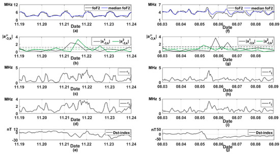Figure 10 shows the results of the application of HMTS and NARX SPA for hourly foF2 data during magnetic storms that occurred on 21–22 November 2017 and 5–6 August 2019. NARX SPA errors were calculated in a 3-h moving time window: . Figure 10e,j shows the geomagnetic activity Dst-index, which characterizes geomagnetic disturbance intensity during magnetic storms. Dst-index takes negative values during magnetic storms. The increases in HMTS and NARX SPA errors during the analyzed magnetic storms (Figure 10b–d,g–i) indicate ionospheric anomaly occurrences. The results show that HMTS and NARX SPA allow us to detect ionospheric anomalies successfully. However, an increase in NARX SPA errors is also observed in wintertime on the eve and after the magnetic storm (Figure 10c,d). This shows the presence of false alarms.