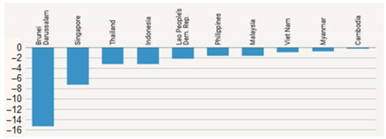 Fiscal policy, which had proven to be a good policy in past crises, can provide productive results in the current pandemic. All measurements taken to subsidize the economy can cause a fiscal deficit (FD). Fiscal deficits can further cause economic problems. One of the main problems caused by FD is the current account deficit [7,8]. If fiscal deficits remain high and persistent during 2019–2020 and onward, it would be a matter of concern for economists, and policymakers in the ASEAN region. The United Nations Economic and Social Council for Asia and Pacific (UNESCAP) has forecast the fiscal balance 2019–2020 [9] in ASEAN members as shown in Figure 1, where every member country is facing a negative fiscal balance (fiscal deficit). Also, the health sector is the most resilient sector of the economy. Health care expenditures across the world have sharply increased in 2020 due to the pandemic. Furthermore, economists and policymakers have forecast a rise in health expenditures in 2021 and onward in ASEAN. Thus, heavy budgets are allocated for health by many ASEAN members, for instance, Vietnam is spending heavily on its healthcare sector. Malaysia allocated six billion to health expenditure in 2020, a 1.9 billion increase from the previous budget of 2019. Also, Singapore raised health expenditures from 4 billion dollars to 12 billion dollars to ensure the health quality of their citizen. An increase in health expenditures can bring the fiscal balance into further deficits. Table 1 shows the ASEAN-10 fiscal deficit and health expenditures in the year 2020.