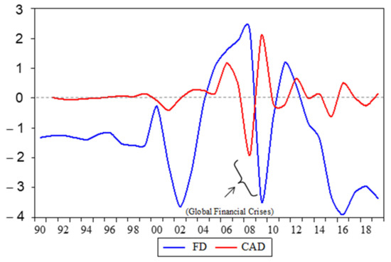 Equation (5) refers to the long-run relationship. The is the coefficient value between CAD and FD at periods and . Similarly, and present the coefficient value of EXC and IR. Similarly, Equation (6) refers to the short-run dynamics. , , , , and indicates the coefficient values of differenced tested variables for short-run dynamics. The coefficient corresponds to the error correction term (ECT). The ECT coefficient validates the adjustment towards equilibrium. It also gives information about the long-run correlation between tested variables in Equation (7).