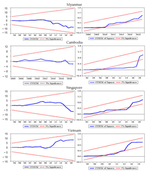 The cumulative sum (CUSUM) test is used to identify the stability of parameters inside the model. The two red lines are presenting the critical bounds at a 5% significance level, while the blue line shows the process mean. If the mean trend diverges towards the V-mask, this means that the process is out of control, reflecting the presence of unexpected shocks, which can make the economic situation go out of control. The CUSUM of squares (CUSUMSQ) test is used to identify the coefficient constancy in the model. The outside values of the sequence suggest the occurrence of a structural change in the model over time. The CUSUM and CUSUMSQ tests help to identify the long-run parameters stability and structural changes in each cross-section along with the short-run moments. Thus, it is concluded that the model parameters are stable throughout the panel. The short-term structural changes can be observed in a few countries of the panel, like Cambodia, Myanmar, Vietnam, and Singapore as shown in (see Figure 4). However, by observing the values that lie outside the critical bounds in the CUSUMSQ graphs, it can be disclosed endogenously that the volatility occurs mostly after 2007–2008, which was the period of the GFC.