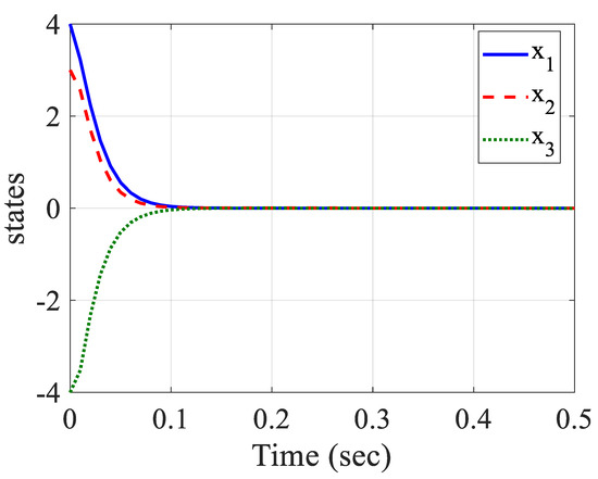 For simulation, consider the initial values as , and from Equation (41), take the Lipschitz constants . The achieved parameters of and via MATLAB YALMIP toolbox are obtained as: