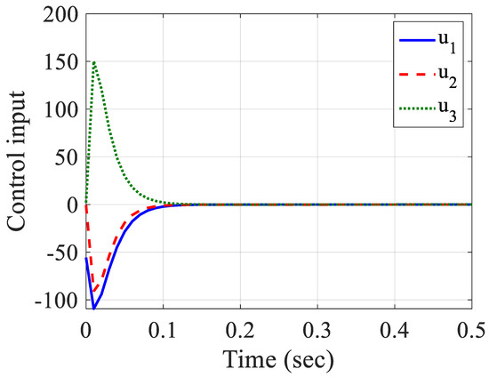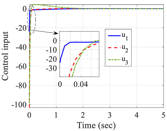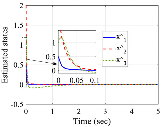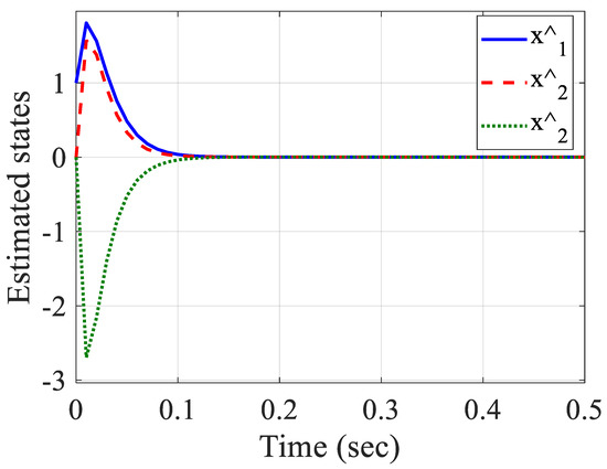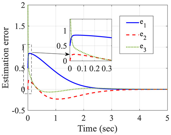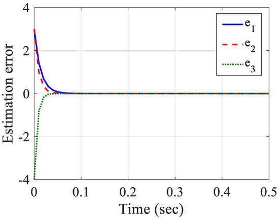 Similar to before, the system state, estimated states, signal controls and state estimation errors are demonstrated in Figure 7, Figure 8, Figure 9 and Figure 10. Figure 7 shows the convergence of the state variables to zero without any overshoot and it was achieved before 3 s. Figure 8 demonstrates the estimated states converging to the origin. It shows the efficiency of the designed observer-based control method that could estimate the unmeasurable states of the system in a short time and stabilize them. Figure 9 depicts the control inputs that stabilized the closed-loop system before two seconds without overshoot and chattering. The estimation error of the observer is demonstrated in Figure 10. From these simulation results, it could be expressed that the suggested control scheme could be applied on nonlinear systems with irregular behavior.
