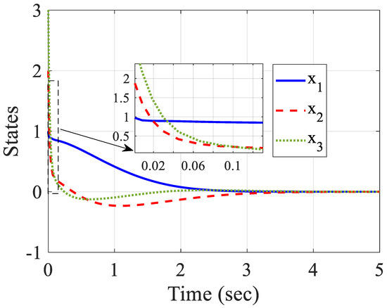 The disturbance and parametric nonlinear function are considered as , . For the simulation, consider the initial values and the Lipschitz constant as , and Ω = 2. The achieved parameters and by MATLAB YALMIP toolbox are as follows:
