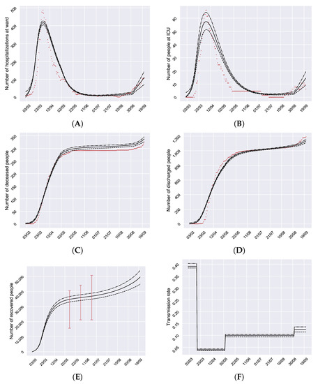 Model calibration. (A) Number of daily hospitalized at ward people. (B) Number of daily people in ICU. (C) Number of accumulated deceased people. (D) Number of accumulated discharged people. (E) Number of accumulated recovered people. (F) Transmission rate . The black bands are the mean and the CI95%. The red points are the data from the hospitals. Vertical red lines in (E) show the confidence intervals of the prevalence in Granada given by [17,18].