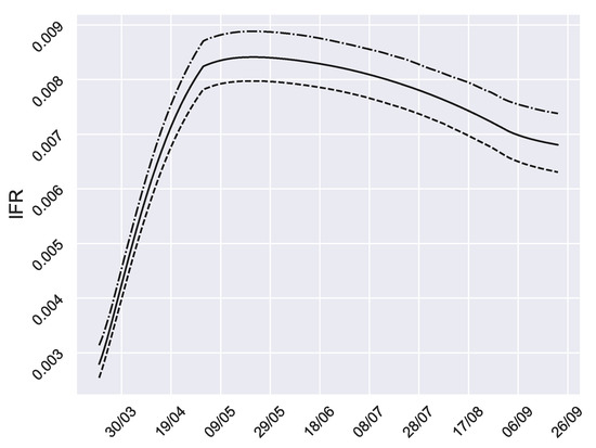 Furthermore, in Figure 3, we can see the evolution of the infection fatality ratio (IFR), that is, the proportion of infected people who die (accumulated). This is a measure of the disease severity [33]. After April 2020, the IFR decreased until October, corresponding to the non-virulence season.