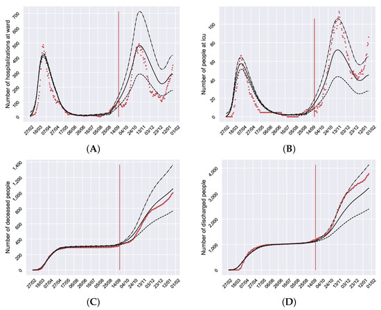 Model validation. (A) Number of daily hospitalized at ward people. (B) Number of daily people in ICU. (C) Number of accumulated deceased people. (D) Number of accumulated discharged people. The vertical red lines (23 September 2020) divide the calibration from the validation. The black bands are the mean and the CI95% of the model outputs. The red points are the data collected from the hospitals. The model captures most of the data red points after 23 September, predicting the evolution of the second and the third wave.