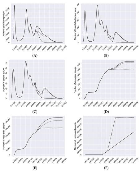 Figure 5 shows that the 3rd wave is finishing and the 4th wave will start soon because at the beginning of March the restrictions have been relaxed. However, the peak of this 4th wave may be high if we are not careful satisfying the population measures (solid black line in Figure 5). The application of strong restrictions again or the increase of the pace of vaccination are the strategies to avoid a new high wave (dotted and dashed lines in Figure 5) and quickly starts to decline the number of infected. Similar effects can be seen in hospitalizations and ICU graphs. In Figure 5D, a stabilization in the deaths can be seen around May.
