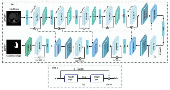 The up-sampling layers utilize the transposed convolution of size 3 × 3 and stride of 2 × 2. The transposed convolution serves as a deconvolution layer and performs the up-sampling of images with proper learning instead of the simple up operation, which only doubles the dimension of the input image without any weights. They are also known as fractionally strided convolutions. Suppose that if a convolution is applied from left to right on inputs and outputs which are unrolled into vectors by kernel and stride of one unit without padding, then we have a matrix called a sparse matrix through which convolution can be represented. In a sparse matrix, the non-zero elements of the kernels are represented by . On the other hand, if the transpose of a sparse matrix is obtained, then a backward pass of the convolution operation is easily attained. The error is backpropagated and the transpose of a sparse matrix is multiplied by the loss. A convolution is defined by kernel, whose forward and backward passes are calculated by taking the product of the sparse matrix and its transpose. Similarly, the forward and backward passes of transposed convolution defined by kernel are computed by multiplying the sparse matrix and . The pattern of up-sampling layers consists of transposed convolutions followed by skip connections, MPCs, and Res blocks. The total number of filters in each transpose convolution layer is 128, 64, 32, and 16, respectively. The main purpose of these downsampling layers is to recover the size of the feature maps by adding spatial and contextual information to the segmentation image. We can transfer the contextual information from the down-sampling layers to the up-sampling layers with the help of skip connections. In the end, a convolution of size 1 × 1 followed by a sigmoid activation function is used to get the final segmented image of 256 × 256 × 1.