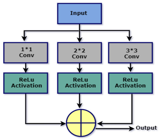The architecture of the MPC contains parallel convolutions utilizing different filter scale sizes of 1 × 1, 3 × 3, and 5 × 5 followed by ReLu [30] activations, defined as in Equation (2):