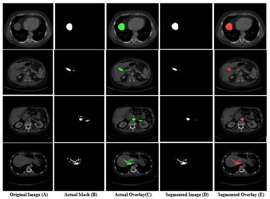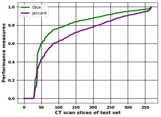 Moreover, some sample images that were segmented by our model are shown in Figure 6. In Figure 6, column (A) shows the original test set slice images, column (B) shows the actual masks of the tumor, column (C) shows the actual overlay results of the original mask over the image, column (D) shows the masks that were predicted by the model, while column (E) shows the predicted overlay results of a predicted mask on the images. It is observed from Figure 6 that the model found difficulty in segmenting very small tumors, as shown in the last row images. Similarly, the model also found difficulty in segmenting in the second row, as shown in columns (B) and (D) of Figure 6. All the scores were calculated with the help of predicted and actual masks, which are shown in columns (B) and (D) of Figure 6. Furthermore, the Dice and Jaccard scores of individual CT scan slices in the test set is shown in Figure 7. In Figure 7, the x-axis shows the number of CT scan slices, while the y-axis shows the dice and Jaccard score. It is observed from Figure 7 that, for most CT scans, the Dice score was above 80.