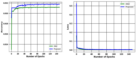 Moreover, we also checked the model loss over several epochs during the training of our proposed algorithm. Usually, when the model loss is near to zero or becomes constant over a certain number of epochs, then the model prediction is perfect. The loss curves of our proposed method are shown in Figure 8. Furthermore, the accuracy of the proposed model over epochs during training is also shown in Figure 8. Accuracy determines the correct number of predictions over all classes. The loss and accuracy curves of U-Net proposed by Ronneberger et al. [33] are also given in Figure 8.