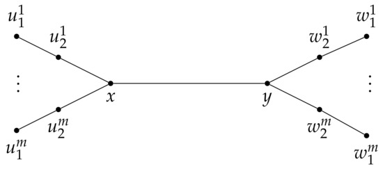 If T has a strong stem or adjacent stems, then, by Propositions 2 and 5, we have Hence, we assume that T has no strong stem and no adjacent stems. It follows that . According to Lemmas 1 and 2, we may assume that . If x or y is a stem, then by Propositions 9 and 11, we have Hence, we assume that neither x nor y is a stem. If x (resp., y) is a leaf with support vertex (resp., ) of degree 2, respectively, then for , is a path in T with , and therefore by Propositions 6 and 11, we have Thus, we may assume that, if both x and y are leaves, then the stem of x or y is of at least degree 3.