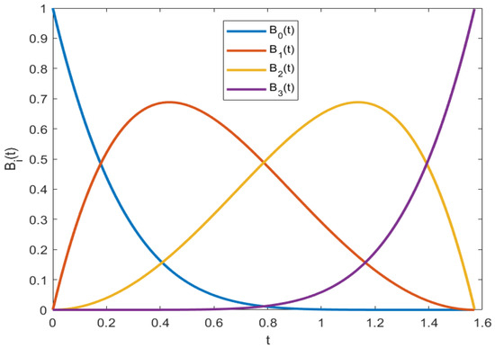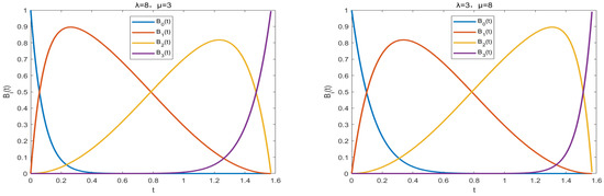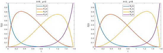 By analyzing the structure of the function , we have on . So satisfies Equation (1). The analysis of is the same. The figure of the corresponding generalized quasi cubic trigonometric Bernstein basis functions defined in Equation (5) are shown below in Figure 2.