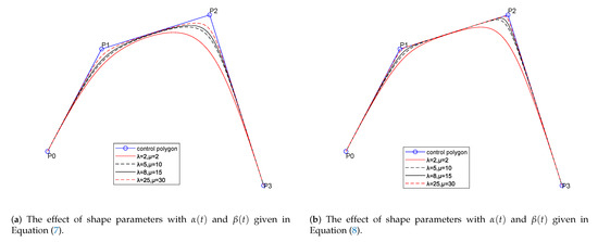 These shape preserving properties mainly include monotonicity preserving and variation diminishing, with more details stated in [23,24,25,29,30]. On the one hand, monotonicity preserving indicates that the curve has the same monotonicity as the monotone control points, and the length of the generated parametric curves is bounded above by the length of their control polygon. If the control polygon is planar and convex, then the curve is also planar and convex. On the other hand, the basis functions have variation diminishing property, so the curve never crosses a hyperplane more often than its control polygon does.