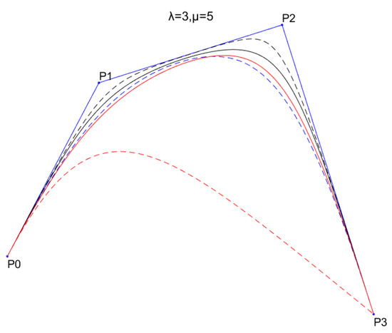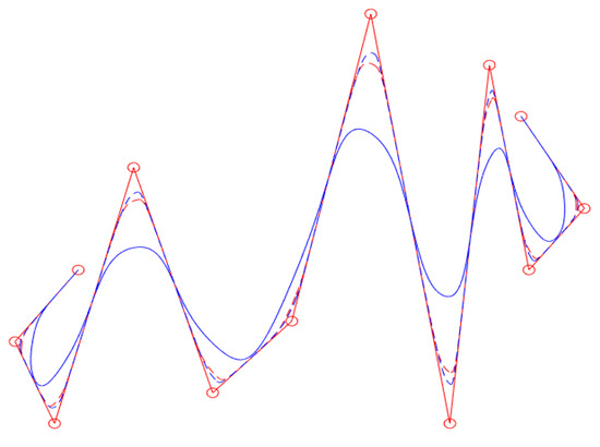 Figure 10 shows the comparison among the new proposed generalized quasi cubic trigonometric B-spline curves (blue dashed lines with and given in Equation (13) and red dashed lines with and given in Equation (14)) and the trigonometric B-spline basis functions defined in [18] (blue solid lines). It is easy to conclude that for the same weights, the proposed generalized quasi trigonometric B-spline curves are closer to the control polygon than trigonometric B-spline basis functions defined in [18] under the same control points and the same parameters. What is more, the shape of the new proposed curves are more smooth.