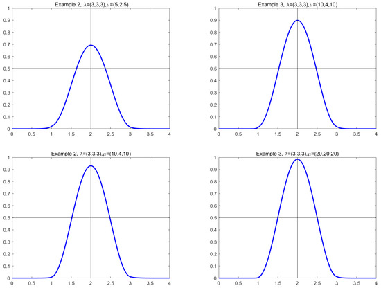 There are many shape functions that satisfy Equation (1). Here we analyze three specific examples and show some plots of these examples. In order to state conveniently, in the following discussion, we will also denote the four generalized quasi cubic trigonometric Bernstein basis functions as , or , and .