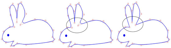 Figure 8 shows the open spline curves with and given in Equation (13) with different shape parameters, which implies the shape of a rabbit. The first one is constructed by setting all . The second one is constructed by changing one from 2.4 to 6 based on the first one. The third one is constructed by changing other two from 2.4 to 4 based on the second one.