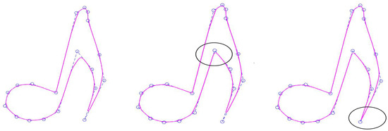 Similarly, Equation (14) also satisfies the additional conditions. Figure 9 shows the open spline curves with and given in Equation (14) with different shape parameters, which describes the shape of a note. The first one is constructed by setting all . The second one is constructed by changing one from 2.5 to 6 based on the first one. The third one is constructed by changing another one from 2.5 to 6 based on the second one.