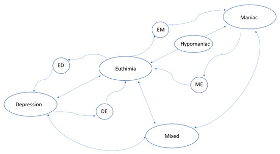 Based on these types of BDD disorders, the psychiatrist diagnoses the situation of the patient corresponding to one of the following states: Depressed, Hypomanic, Manic, or Mixed. Clinically, a crisis is defined as the appearance of one of those states. The absence of any of them is a state known as Euthymic (i.e., the patient does not suffer from any crisis). In this study, the variable “diagnosis” takes one of these 5 states (Depressed, Hypomanic, Manic, Mixed, or Euthymic). These states can be described according to clinical indicators, mood changes, or phases of the disease already described in clinical practice. The clinician modifies the diagnosis (or state), after observing significant symptoms that characterize a different new state. Figure 1, elaborated by the authors, shows the general state transitions: the nodes are the five main BDD states plus 4 more nodes for intermediate states (ED, DE, EM, and ME). The arrows show the transition between states.