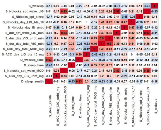 Figure 2 shows the correlation matrix of the first 15 ranked variables obtained for patient P07 from the feature selection procedures. The colour code is red, maximum value of correlation; white, minimum correlation; reddish, positive correlation; bluish, negative correlation. The results showed some highly dependent variables, such as variables related to nighttime activity (S_dur_spt_wake_LIG_min, S_Nblocks_spt_wake_MOD and S_Nblocks_spt_wake_LIG). It can also be concluded that this patient (P07) engaged in light and moderate physical activities in the nights of recordings. The high correlation (0.83) between D_sleep_zenith and D_wakeup_time means that, regardless of the time patient P07 fell asleep, the number of sleeping hours was almost the same every day.