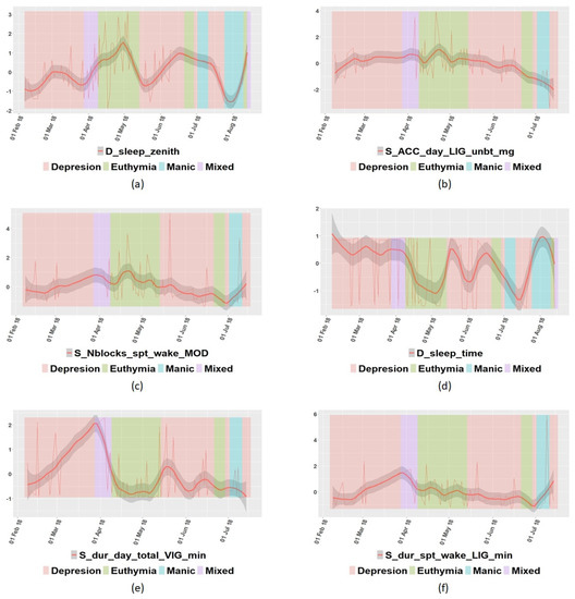 In addition to the correlation among features, some specific variables were further analyzed. In Figure 3, some variables from patient P07′s data are represented, and some interesting insights can be drawn. For example, Figure 3a shows that P07 tended to sleep better in the euthymic state, and according to Figure 3b, this patient engaged in less light physical activity when in the depressed state. In Figure 3c, it is shown that patient P07 usually woke up more often in the euthymic state than in any other state. Figure 3d shows that this patient fell asleep earlier in the euthymic state than in any other case. In Figure 3e, it is possible to observe that the level of vigorous physical activity was unstable when depressed. Finally, Figure 3f allows us to conclude that patient P07 engaged in the same light physical activity in the sleep period times in any state. This information can help to establish some rules to predict the state of each particular individual.
