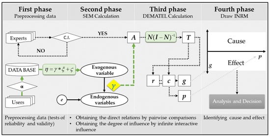 The proposed SEM-DEMATEL method combines both SEM and DEMATEL methods to reveal the direct path coefficients, confirm the interdependence of criteria and dimensions, and convert their causal relationships into an intelligible structure. In order to distinguish between the traditional DEMATEL approach and the SEM-DEMATEL method, please see Figure 1. The operation process of the traditional DEMATEL is indicated by the black dotted line, and the procedure of the novel method is shown by the green dotted line. The research method was divided into the following four phases: