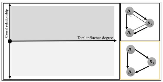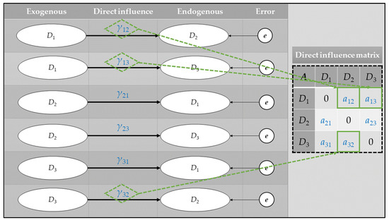 A case study is used for further illustration. For example, an evaluation system consists of three dimensions of D1, D2, and D3. First, D1 is set as an independent variable and D2 as a dependent variable. Using Equations (1) and (2), a12 can be derived. Next, D1 is set as an independent variable and D3 as a dependent variable. Using Equations (1) and (2), a13 can be derived, and so on. Six permutations of the direct influence relations (a12, a13, a21, a23, a31, a32) are systematically revealed, as depicted in Figure 2. The left side of Figure 2 shows the direct influence relations among three dimensions; the right side demonstrates the direct influence relationship matrix derived from the direct influence relations on the left.