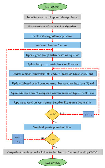 The process of updating the population matrix is repeated until the end of the algorithm. After the last iteration of the algorithm, the best quasi-optimal solution obtained with the GMBO is available as the output of the algorithm. The various steps of implementing the proposed GMBO algorithm are presented as pseudocode in Algorithm 1 and also as a flowchart in Figure 1.