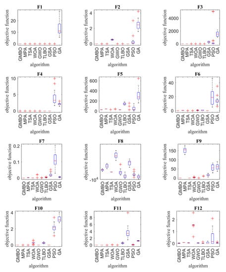 Six F8 to F13 objective functions were selected to evaluate the performance of the GMBO and eight other optimization algorithms in optimizing high-dimensional multimodal functions. The optimization results of these objective functions are presented in Table 3. Based on this table, the GMBO is able to provide the basic optimal solution for the F9 and F11 objective functions. The GMBO generates the best quasi-optimal solutions for F10 and F12 objective functions. For the F13 objective function, the GSA is the best optimizer, and the GMBO is the second-best optimizer. The optimization results show that the GMBO obtains very competitive results in the majority of high-dimensional multimodal objective functions.