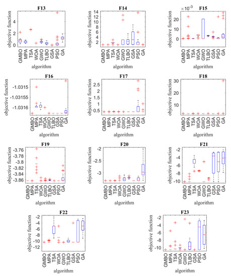 Table 2, Table 3 and Table 4 present the optimization results of the F1 to F23 objective functions using the GMBO and eight other compared optimization algorithms. In order to further analyze and visually compare the performance of the optimization algorithms, a boxplot of results for each algorithm and objective function is shown in Figure 2.