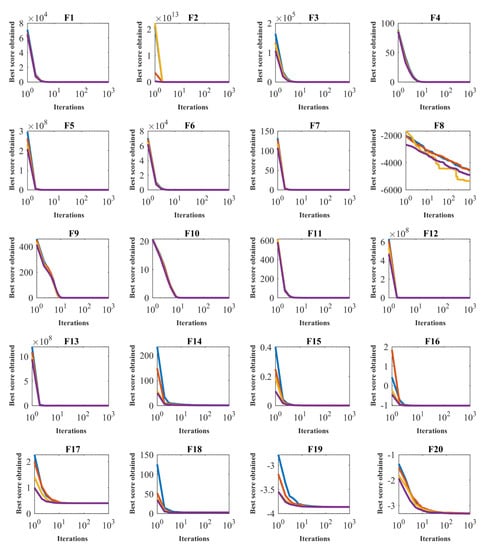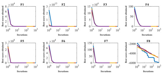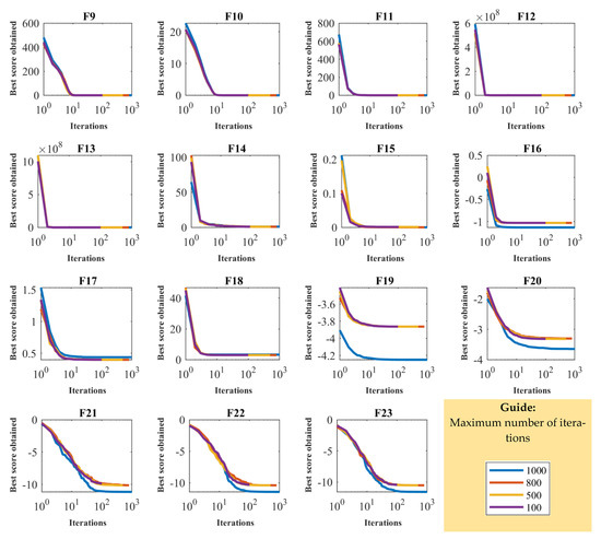 In order to analyze the sensitivity of the proposed GMBO algorithm to the maximum number of iterations parameter, the GMBO was run independently on all 23 objective functions for the maximum number of iterations of 100, 500, 800, and 1000. The performance of the proposed GMBO algorithm, as affected by the different maximum numbers of iterations, is presented in Table 7. The results show that GMBO converges towards the optimal solution when the maximum number of iterations is increased. Convergence curves of the GMBO for the sensitivity analysis of the maximum number of iterations are shown in Figure 4.